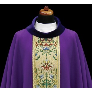 Chasuble made of light fabric, velvet collar, decorated with rich banding and gold-silver ribbon.