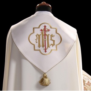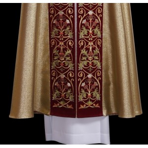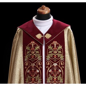 Kapa brokatowa, bogato haftowana na aksamitnym pasie i kapturze, wykończona kutą, złotą klamrą. Haftowany IHS na tyle klapy.