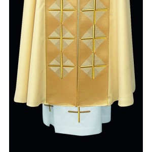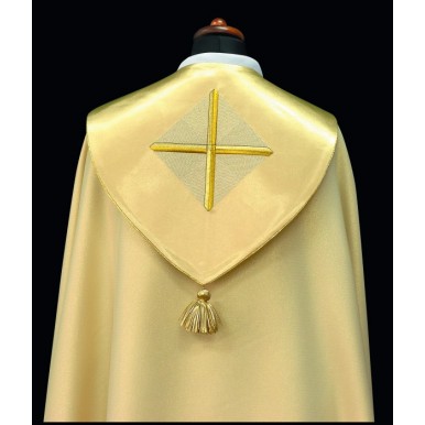 Kapa brokatowa, uszyta z lekkiej tkaniny kremowo-brokatowej, ozdobiona haftowanymi motywami krzyża na satynowym pasie. Kołnierz satynowy z haftowanym pasem.