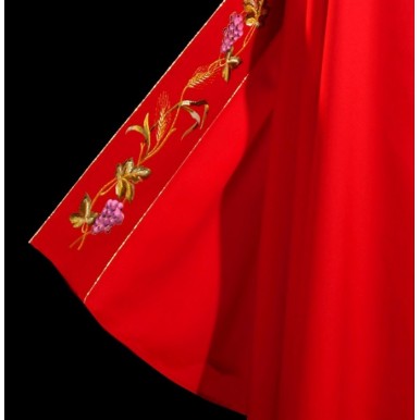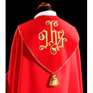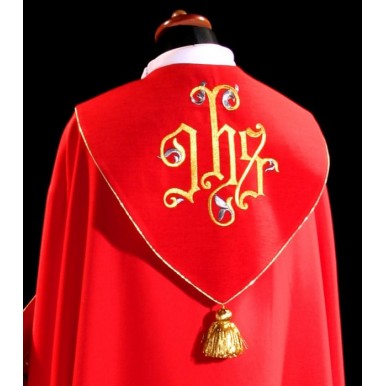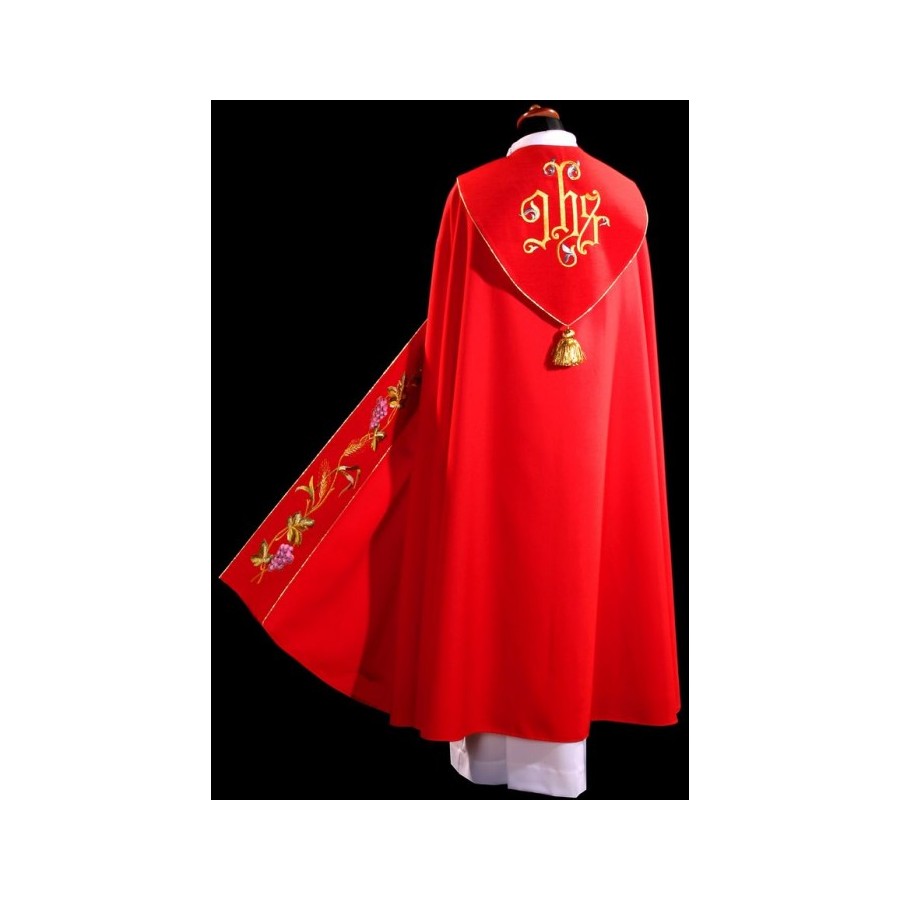 Kapa ozdobiona barwnym haftem eucharystycznym na pasie, kaptur haftowany IHS, wykończony złotą nicią i kutą klamrą.