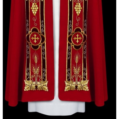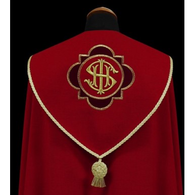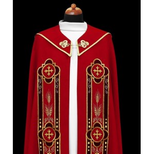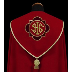 Piękna kapa ozdobiona haftowanymi aplikacjami z bordowego aksamitu. Na kapturze ozdobna, haftowana aplikacja. Całość wykończona tasiemkami i złotą kutą klamrą.