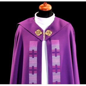 Kapa haftowana nowoczesnym haftem. Kaptur również haftowany. Kapa wykończona złotą klamrą.