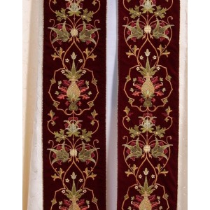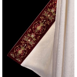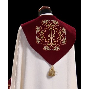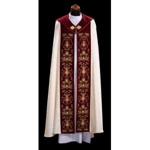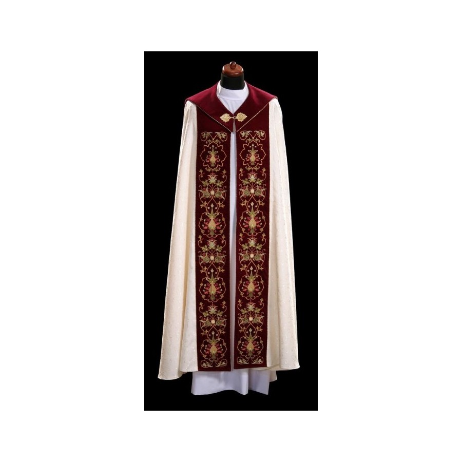 Kapa kremowa, uszyta z ozdobnej tkaniny typu adamaszek z bogatym haftem na aksamitnym pasie. kaptur haftowany. Kapa wykończona złotą klamrą.