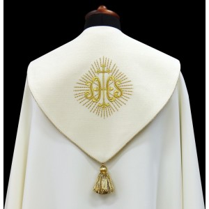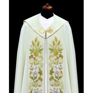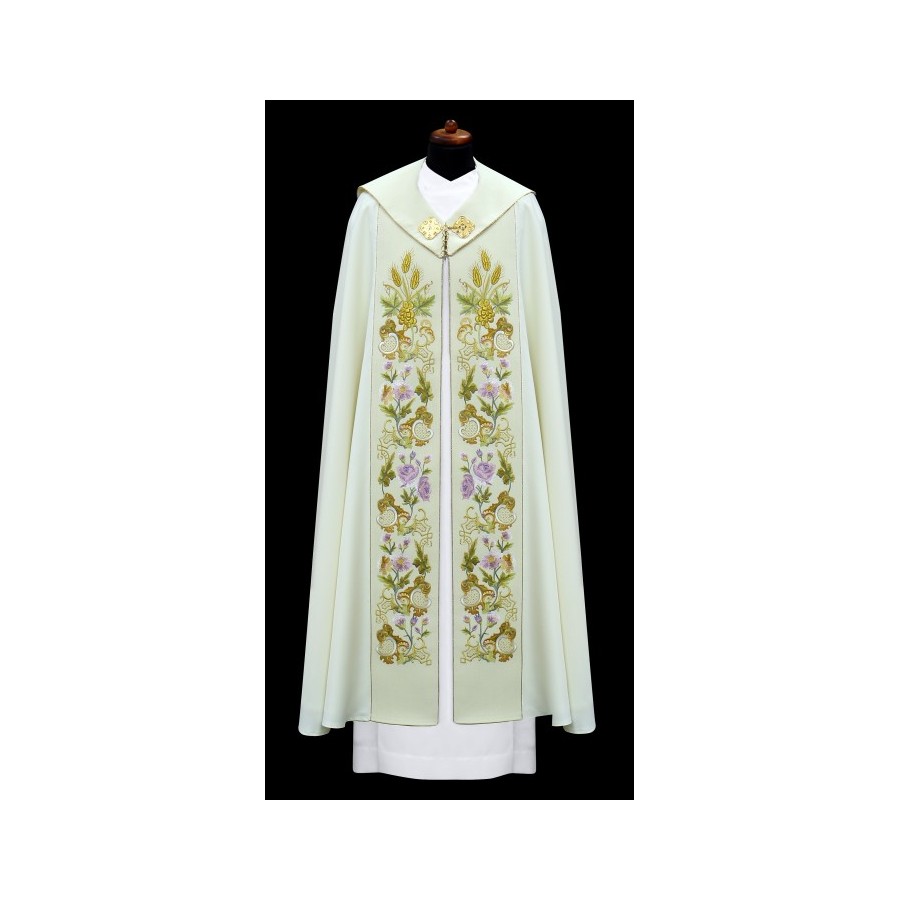 Kapa kremowa, ozdobiona haftem eucharystycznym na pasie, haftowany kaptur IHS wykończony złotą wypustką i klamrą.