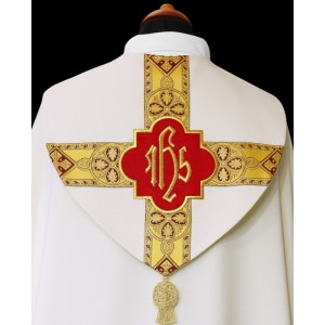 Kapa kremowa, ozdobiona złotym galonem i haftowaną aplikacją na kapturze, wykończona złotą klamrą.