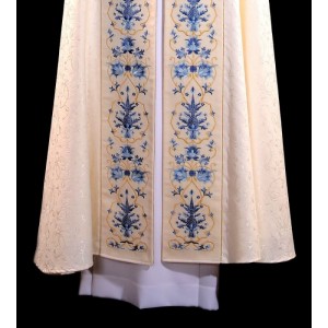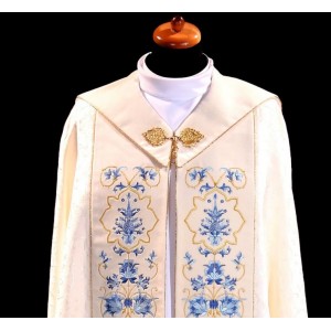 Kapa maryjna, bogato hahtowana na aksamitnym pasie i kapturze w kolorze złota i błękitu. uszyta z bogatej tkniny typu adamaszek, wykończona kutą, złotą klamrą,