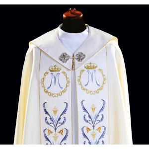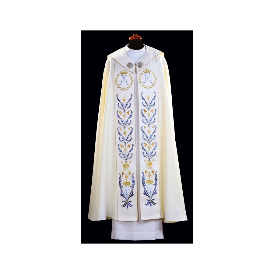 Kapa maryjna, bogato haftowana na aksamitnym pasie i kapturze nićmi w kolorze złota i błękitu. Kapa uszyta z lekkiego brokatu, wykończona złotą kutą klamrą.