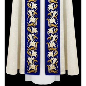 Kapa maryjna, wykonana z lekkiej tkaniny ze srebrną nicią, ozdobiona aksamitnym haftowanym pasem.