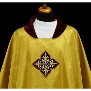 Ornat uszyty z delikatnej tkaniny brokatowej z haftowaną aksamitna aplikacja. Kołnierz również aksamitny.