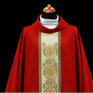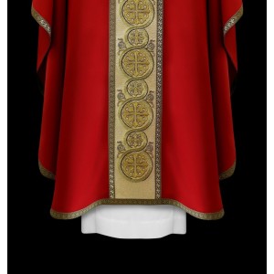 Ornat z bogato zdobioną stułą wewnętrzną. Uszyta z lekkiej tkaniny z bogatym, złotym haftem na ozdobnym pasie. Ornat ozdobiony złotą pasmanterią.