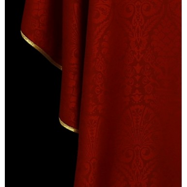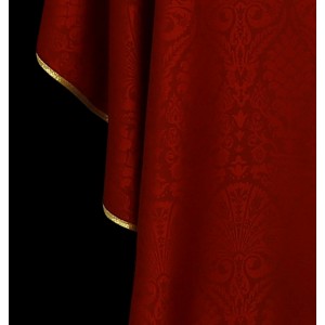 Ornat uszyty z ozdobnej tkaniny z haftowaną aksamitną aplikacja. Kołnierz również aksamitny. Całość wykończona złotą lamówką