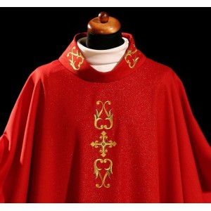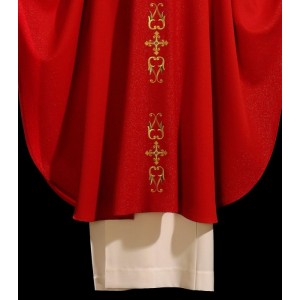 Ornat maryjny z delikatnym haftem. Uszyty w stylu monastycznym z haftowanym kołnierzem ze stułą wewnętrzną.