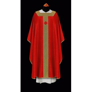 Ornat uszyty z delikatnej tkaniny z przetykaną złoto-srebrną nicią, ozdobiony ażurową taśmą i ręcznie naszywanym krzyżem. Krzyż na ornacie ozdobiony kamieniem. Ornat ze stułą wewnętrzną