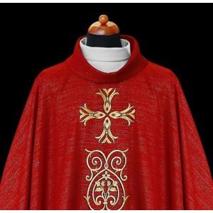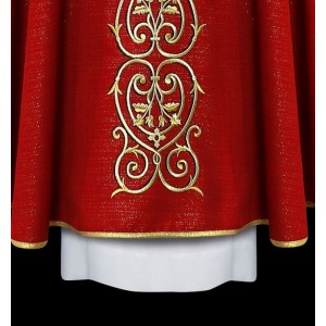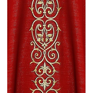 Bogaty haft wykonany na tkaninie z przetykaną złoto - srebrną nicią. Całość ozdobiona atłasową lamówką