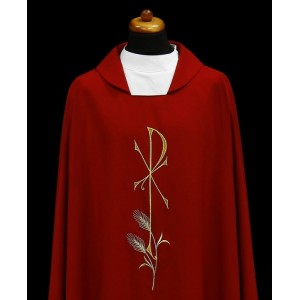 Ornat wykonany z lekkiej tkaniny zdobiony haftem. Całość wykończona złotą, atłasową lamówka.
