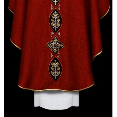 Ornat kremowy uszyty z ozdobnej tkaniny z haftowaną aksamitną aplikacją. Aksamitny kołnierz.