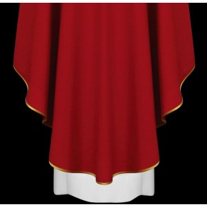 Ornat czerwony wykonany z lekkiej tkaniny z wypukłym haftowanym motywem krzyża.