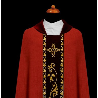 Ornat haftowany w kolorze złota na aksamitnym pasie uszyty z lekkiej tkaniny. Szata, wykończona złotą, atłasową lamówką.