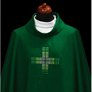 Elegancki ornat uszyty w stylu monastycznym, ze stułą wewnętrzną. Ornat ozdobiony nowoczesnym haftem krzyża, haft również na kołnierzu oraz po bokach. Haft wykonany cieniowaną, satynową nicią.