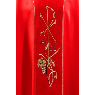 Ornat ozdobiony delikatnym haftem na ciemniejszym pasie z tkaniny przetykanej srebrna nicią. Szata liturgiczna wykończona złotą atłasową lamówką.