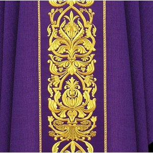 Ornat bogato haftowany złotymi nićmi , uszyty z wysokiej jakości lekkiej tkaniny. Haft wykonany na satynowym pasie. Szata liturgiczna uszyta w stylu gotyckim ze stułą wewnętrzną.