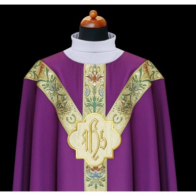 Ornat uszyty z lekkiej tkaniny, ozdobiony tkanymi pasami i haftowanym medalionem IHS. Ornat semigotycki ze stułą wewnętrzną, bez kołnierza.