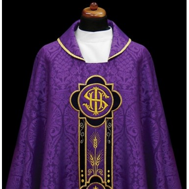 Ornat uszyty z ozdobnej tkaniny typu adamaszek ozdobiony wypukłym haftem, kombinacja apikacji z aksamitu i haftu na tkaninie. Haft wzbogacają wstawki z satyny i złotej taśmy.