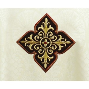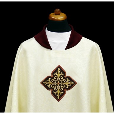 Ornat uszyty z ozdobnej tkaniny z haftowaną aksamitną aplikacja. Kołnierz również aksamitny. Całość wykończona złotą lamówką