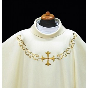 Ornat kremowy wykonany z tkaniny przetykanej srebrną nicią ze złotymi haftami.