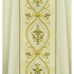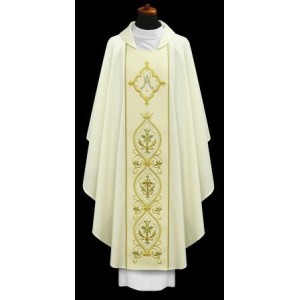 Ornat uszyty z cienkiej wełny. Ornat maryjny w stylu gotyckim ze stułą wewnętrzną. Haftowany złoto barwnymi nićmi.