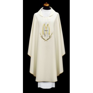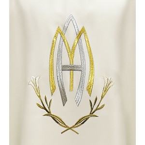 Ornat maryjny uszyty z lekkiej, przewiewnej tkaniny. Haftowany monogram i lilia.
