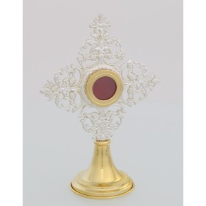 Bardzo okazały relikwiarz mosiężny w formie małej monstrancyki zdobiony rubinami. Dostępny w wersji złotej lub srebrnej.