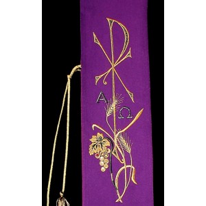 Stuła dwustronna haftowana uszyta z ozdobnej tkaniny z przetykaną srebrną nicią.