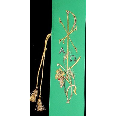 Stuła dwustronna haftowana uszyta z ozdobnej tkaniny z przetykaną srebrną nicią.
